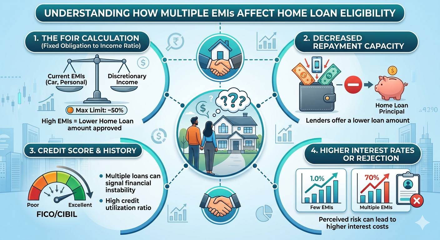 When you apply for a home loan, lenders carefully evaluate your repayment capacity. If you already have multiple EMIs—such as personal loans, car loans, or credit card dues—it directly impacts your ability to take on additional debt.